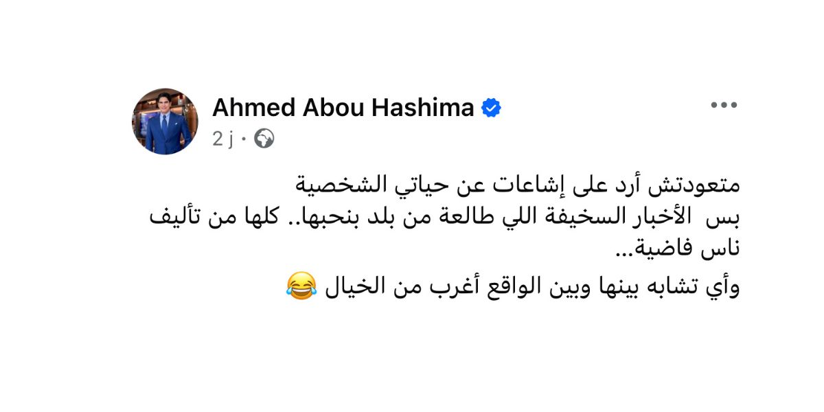 وقد اضطر أبو هشيمة للخروج عن صمته، عقب تداول خبر ارتباطه بنجلة طليقته هيفاء وهبي، ساخرا من الإشاعة، عبر تدوينة على صفحته الرسمية بالفايسبوك، جاء فيها “متعودتش أرد على إشاعات عن حياتي الشخصية بس الأخبار السخيفة اللي طالعة من بلد بنحبها..كلها من تأليف ناس فاضية…وأي تشابه بينها وبين الواقع أغرب من الخيال”، أتبعها بإيموجي ساخر.