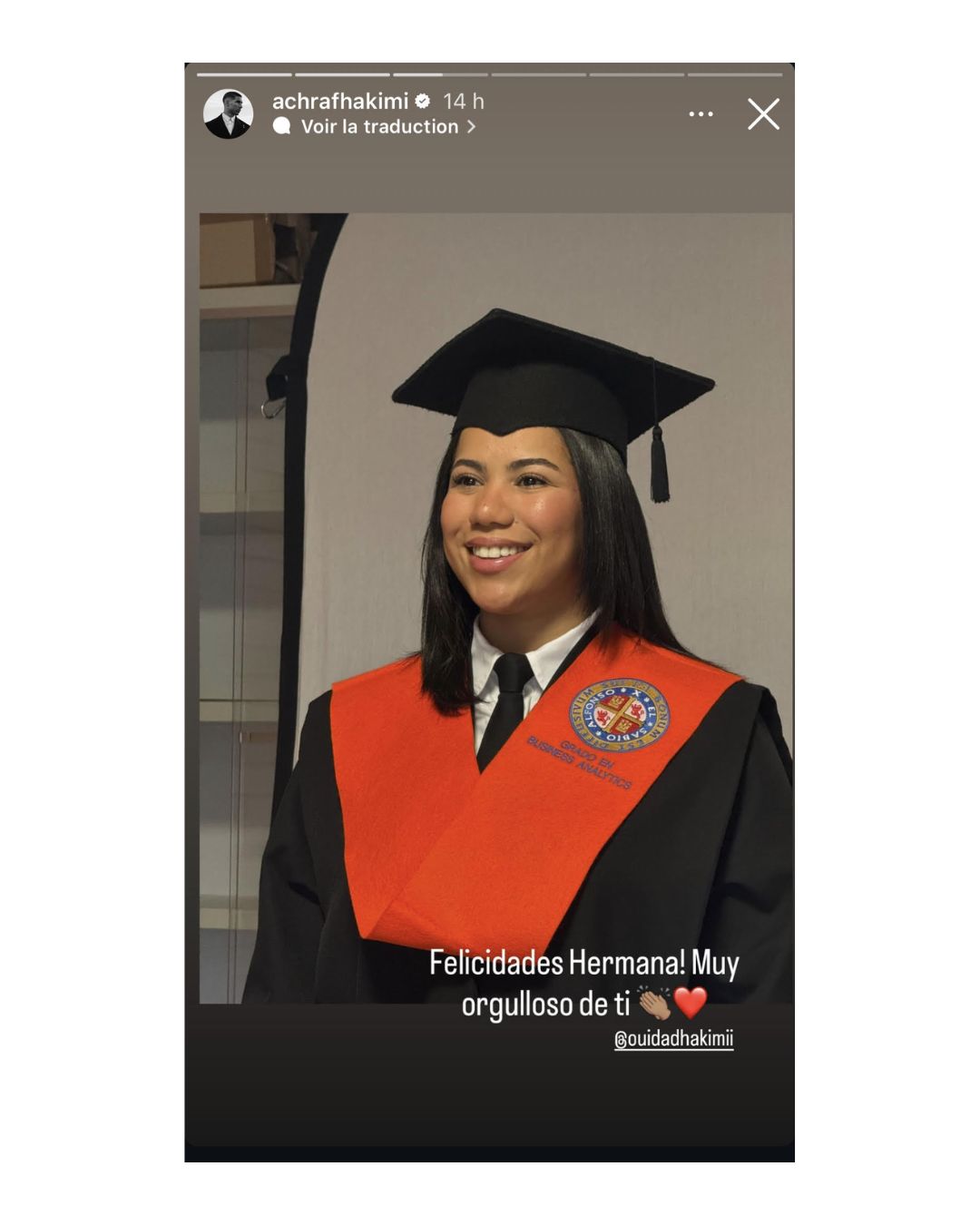 وعمد حكيمي على تقاسم صورة شقيقته بلباس التخرج عبر خاصية الستوري على حسابه الرسمي بموقع تبادل الصور والفيديوهات أنستغرام، علق عليها قائلا  “هنيئا لك أختي، أنا فخور جدا بك”.
