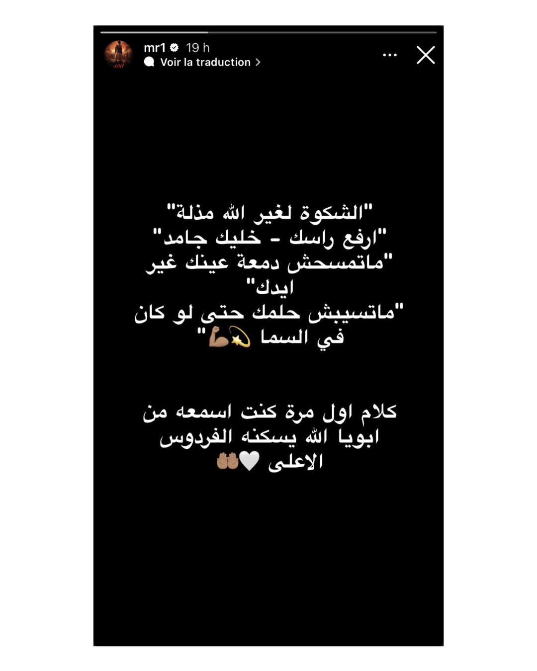 وجاء في ستوري النجم المصري عبر حسابه الرسمي على موقع تبادل الصور والفيديوهات انستغرام “الشكوة لغير الله مذلة”، “ارفع رأسك خليك جامد”، “ماتمسحش دمعة عينك غير غيدك”، “ماتسيبش حلمك حتى لو كان في السما”، كلام أول مرة كنت أسمعه من أبويا الله يسكنه الفردوس الأعلى”.