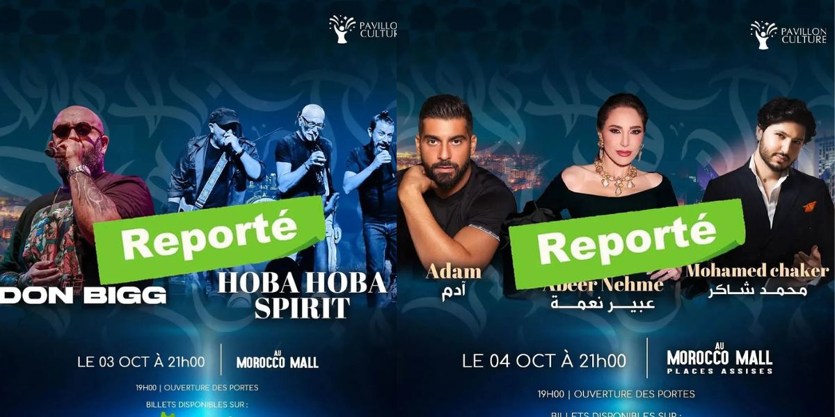 كما تم إعلان إلغاء حفل الفنانيين اللبنانيين: عبير نعمة ومحمد فضل شاكر وآدم، الذي كان مبرمجا يوم ال 4 من أكتوبر بالمكان ذاته، ابتداء من الساعة السابعة مساء.
