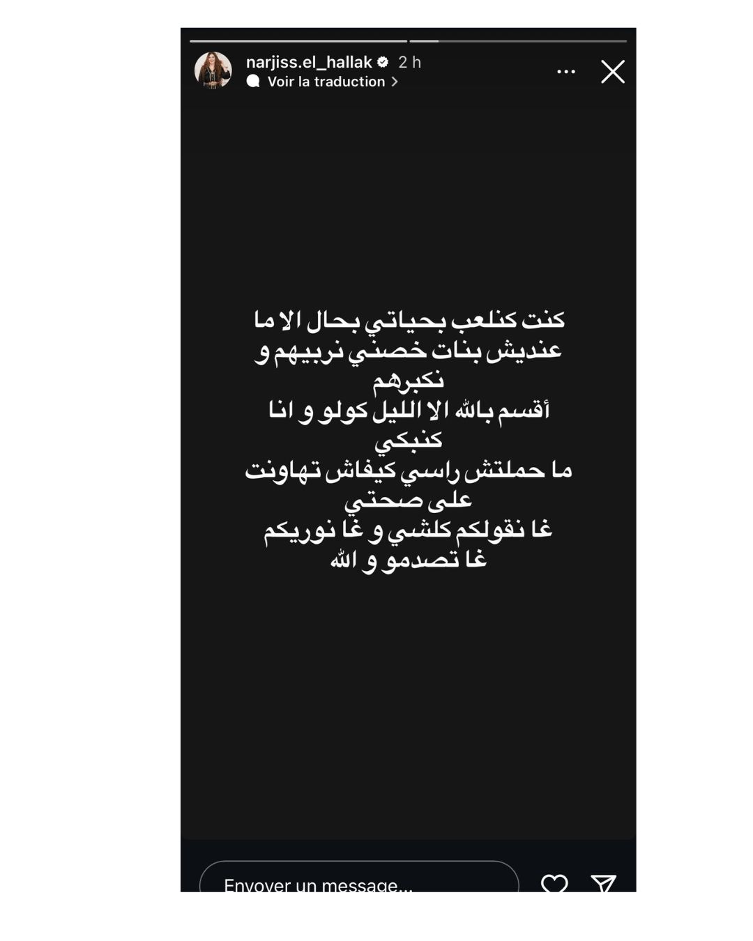 ثم عادت الحلاق لاحقا عبر ستوري، أوضحت فيها تهاونها بخصوص صحتها، مؤكدة أنها سوف تكشف تفاصيل ما حصل معها لاحقا، قائلة “كنت كنلعب بحياتي بحال إلا ما عنديش بنات خصني نربيهم ونكبرهم أقسم بالله إلا الليل كولو وأنا كنبكي ما حملتش راسي كيفاش تهاونت على صحتي غا نقولكم كلشي وغانوريكم غاتصدمو والله”.