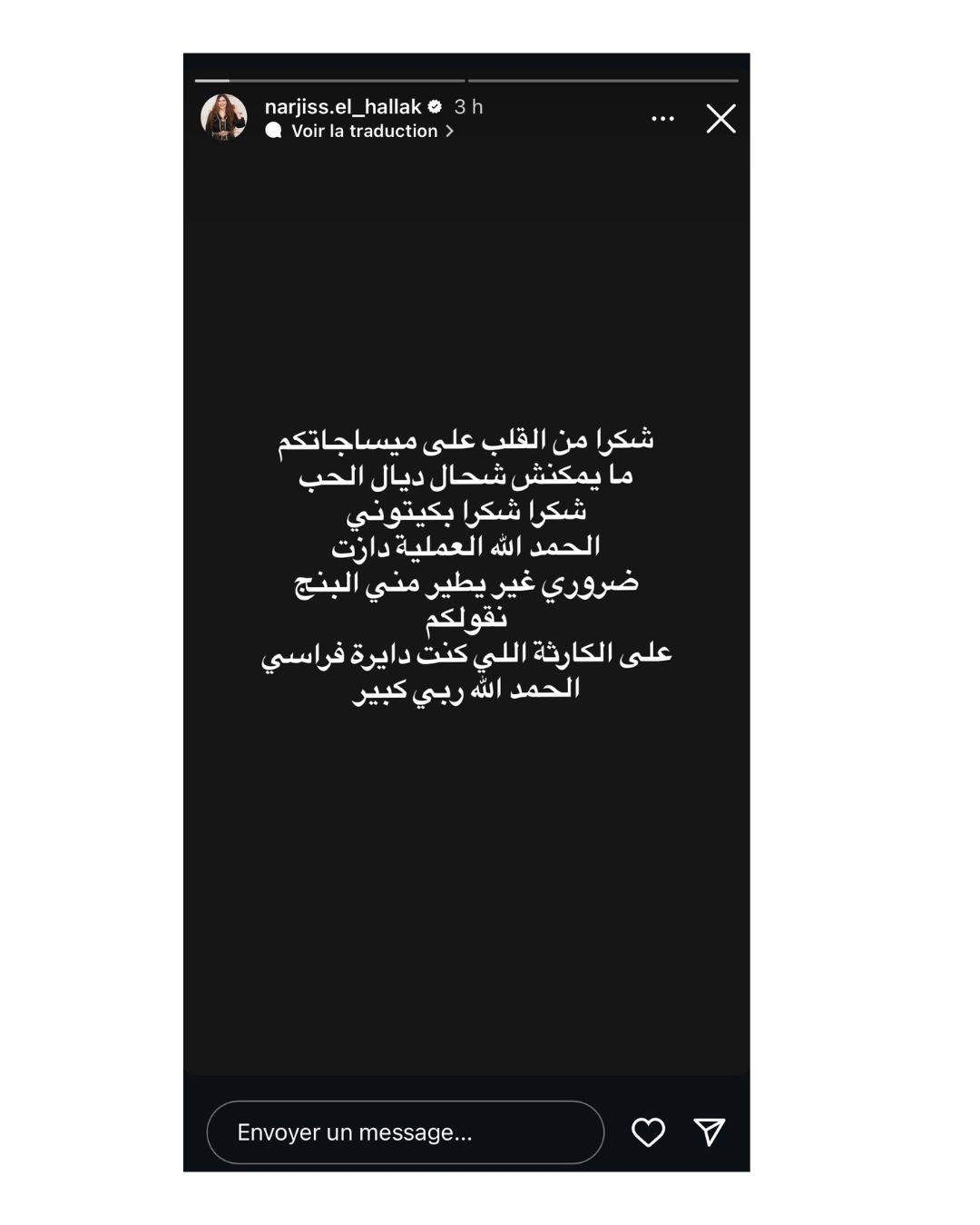 وجاء في الستوري التي تقاسمتها الحلاق مع متابعيها عبر تطبيق تبادل الصور والفيديوهات أنستغرام “شكرا من القلب على ميساجاتكم ما يمكنش شحال ديال الحب شكرا شكرا بكيتوني”.