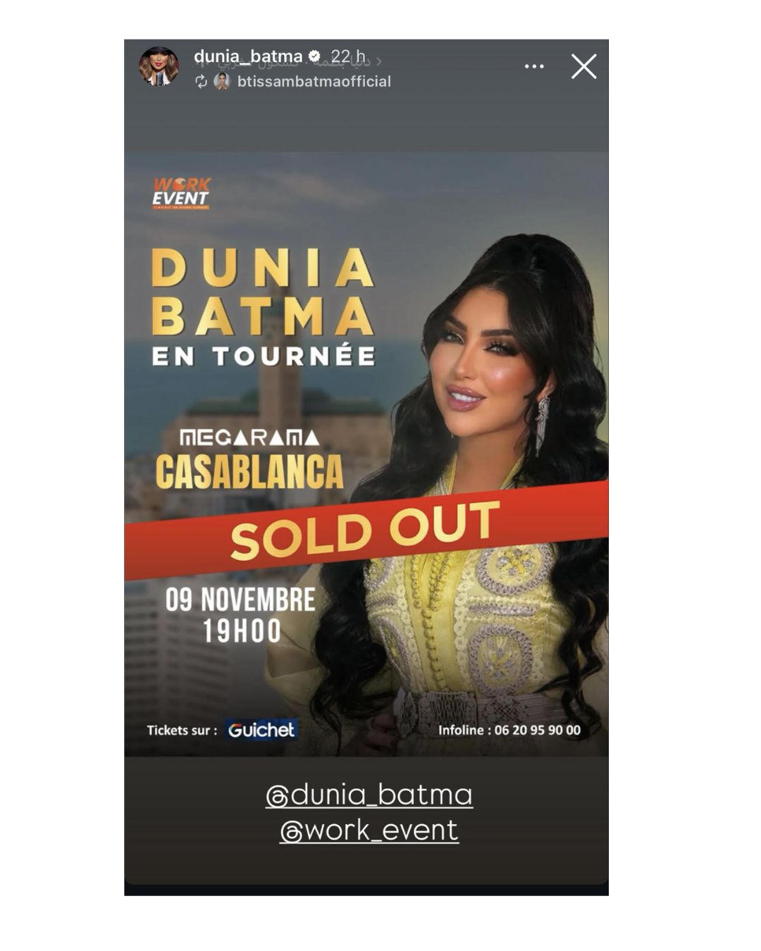 أعلنت الفنانة دنيا بطمة عن تفاذ تذاكر حفلها المقبل بميغاراما الدار البيضاء، وذلك عبر خاصية الستوري على حسابها الرسمي بموقع تبادل الصور والفيديوهات “إنستغرام”.