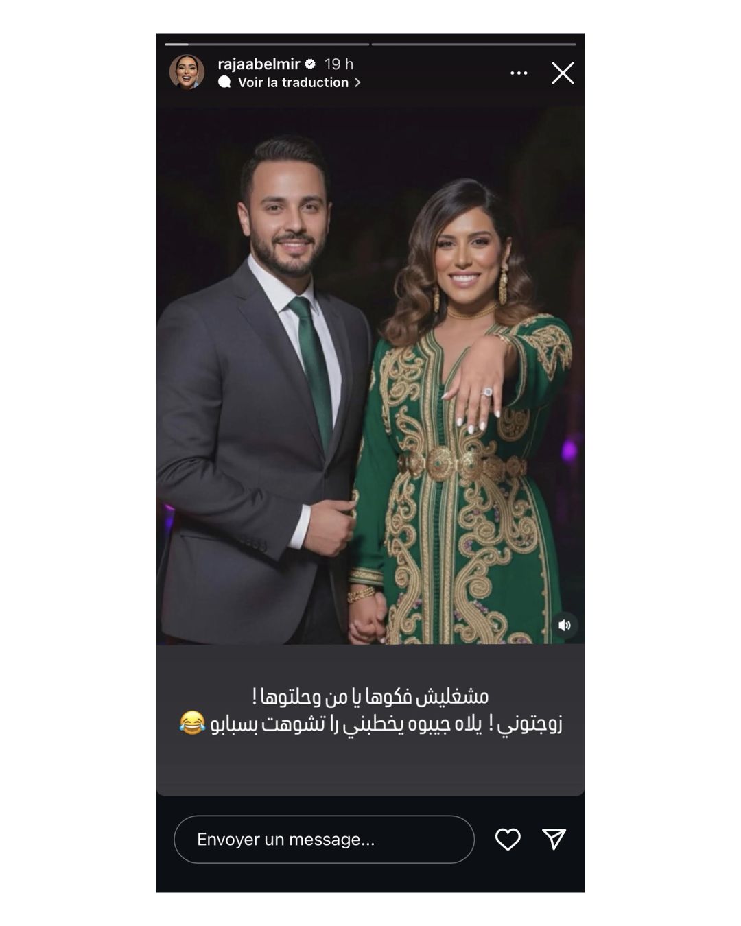 وعمدت رجاء بلمير على إعادة تداول الصورة عبر خاصية الستوري على حسابها الرسمي بموقع تبادل الصور والفيديوهات انستغرام، أرفقتها بتعليق جاء فيه “مشغليش فكوها يا من وحلتوها، زوجتوني يله جيبوه يخطبني را تشوهت بسبابو”.