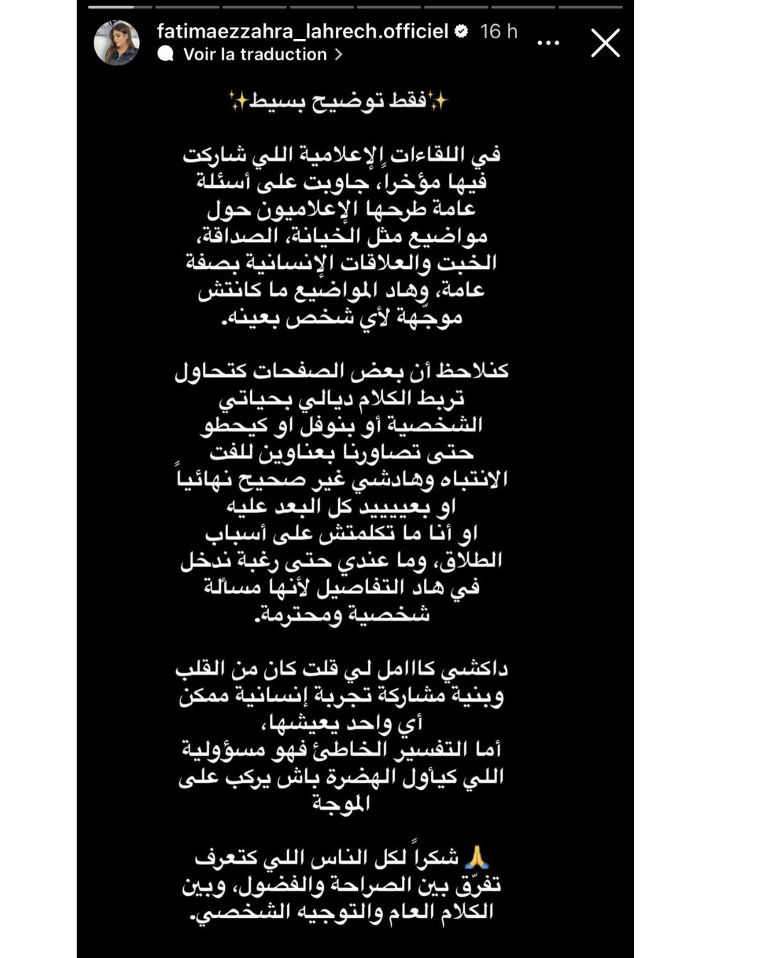 وأضافت “داكشي كااامل لي قلت كان من القلب وبنية مشاركة تجربة إنسانية ممكن أي واحد يعيشها، أما التفسير الخاطئ فهو مسؤولية اللي كيأول الهضرة باش يركب على الموجة، شكرا لكل الناس اللي كتعرف تفرّق بين الصراحة والفضول، وبين الكلام العام والتوجيه الشخصي”.