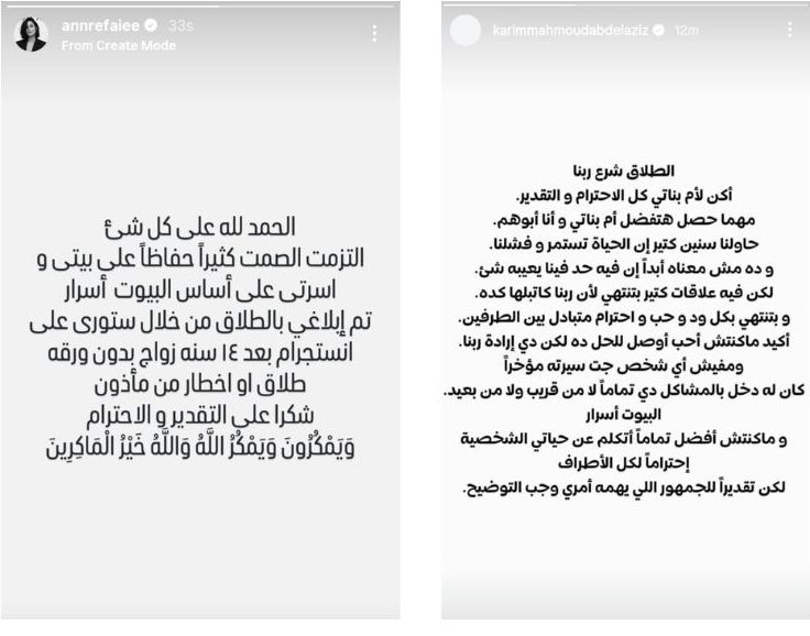 أعلن الفنان المصري، كريم محمود عبد العزيز، انفصاله عن زوجته مصممة الأزياء، آن الرفاعي، يوم أمس الإثنين، وذلك عبر ستوري تقاسمها على حسابه الرسمي على موقع تبادل الصور والفيديوهات “إنستغرام”.