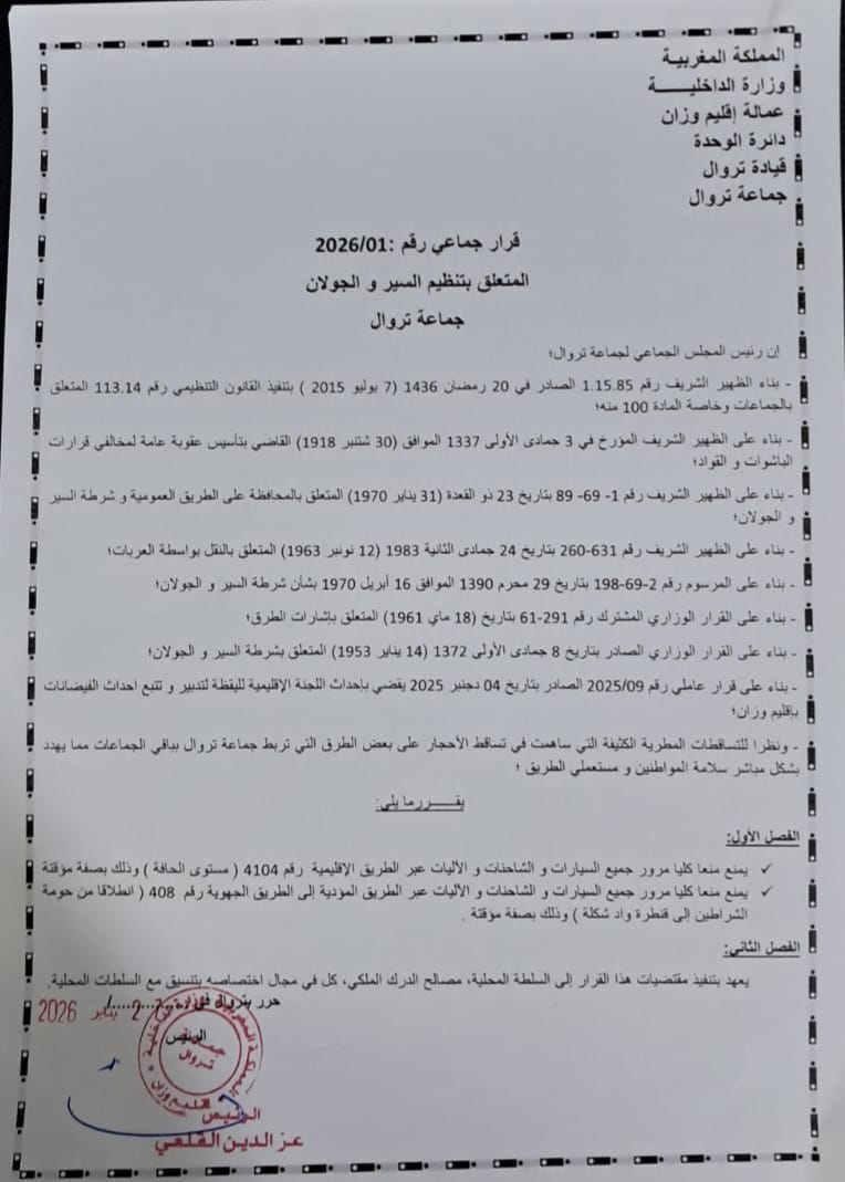 الجماعة الترابية تروال أول جماعة ترابية باشرت تنفيذ تعليمات لجنة اليقظة في اليوم الموالي للاجتماع، وأصدرنا قرارين بإغلاق الطريق 4104 والطريق 4573 التابعة للتجهيز. كما أصدرنا قرارا بتنظيم السير والجولان رقم01|2026 والقرار رقم 04|2026 بموجبهما عهد إلى السلطة المحلية والدرك الملكي إغلاق الطرق كل في حدود اختصاصه.