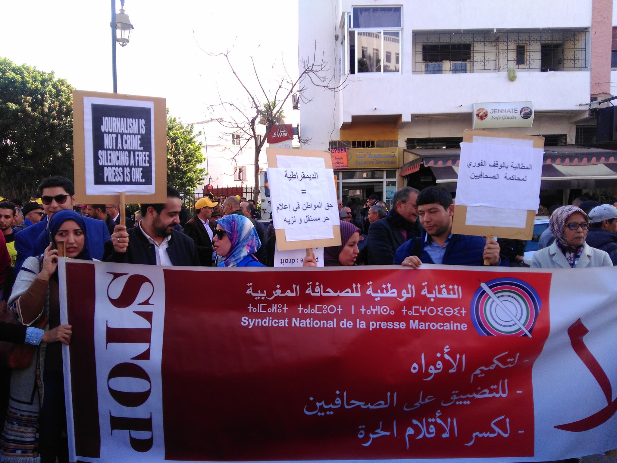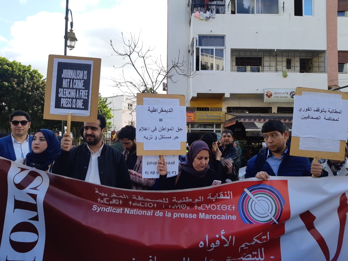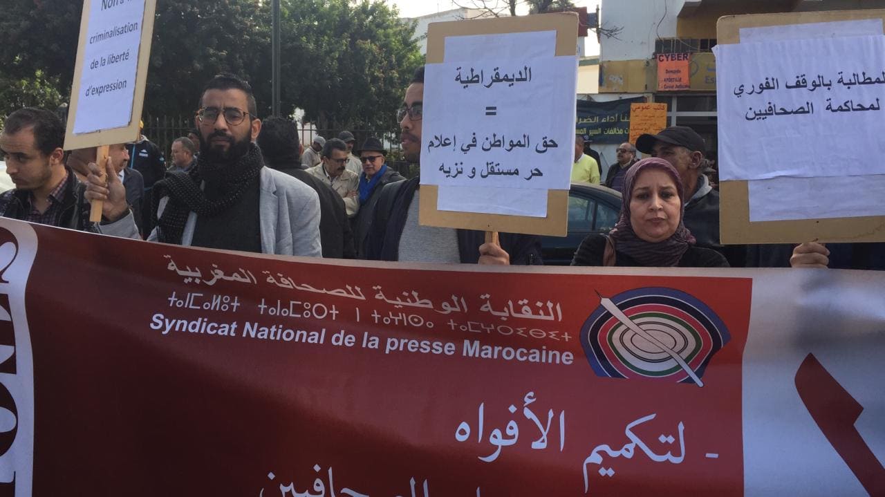 نظمت النقابة الوطنية للصحافة المغربية، وقفة تضامنية، صباح اليوم الأربعاء، مع الزملاء الأربعة المتابعين من طرف رئيس مجلس المستشارين حكيم بنشماش أمام المحكمة الإبتدائية بالرباط.