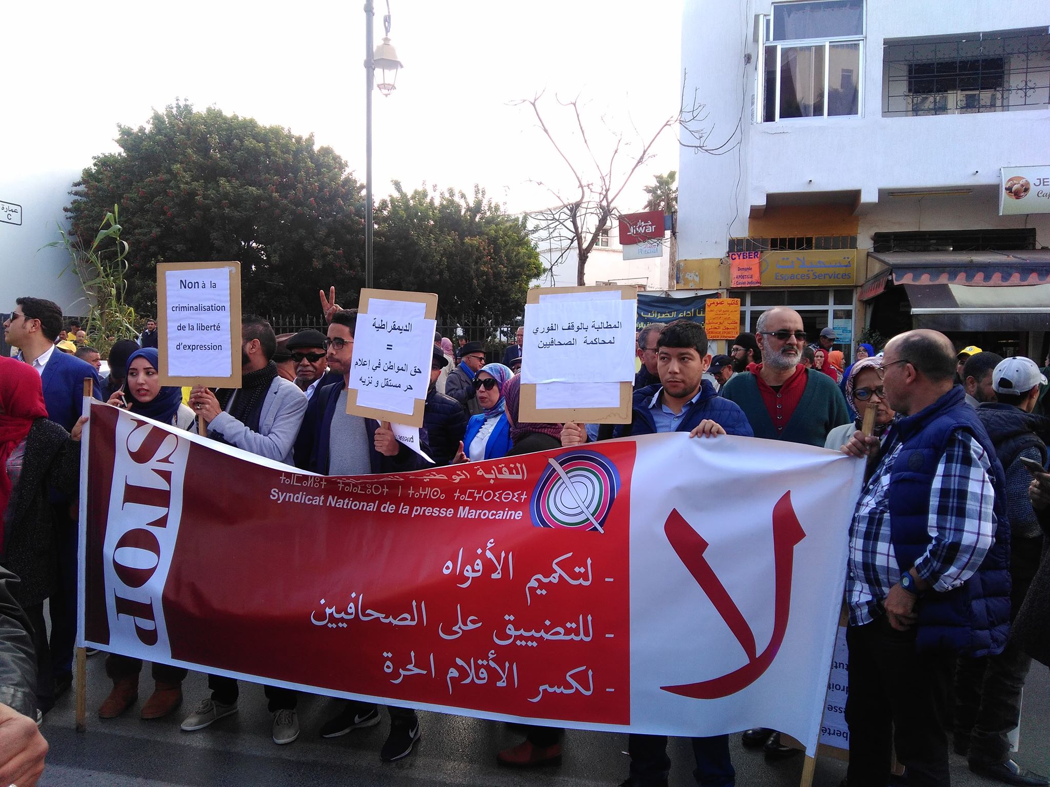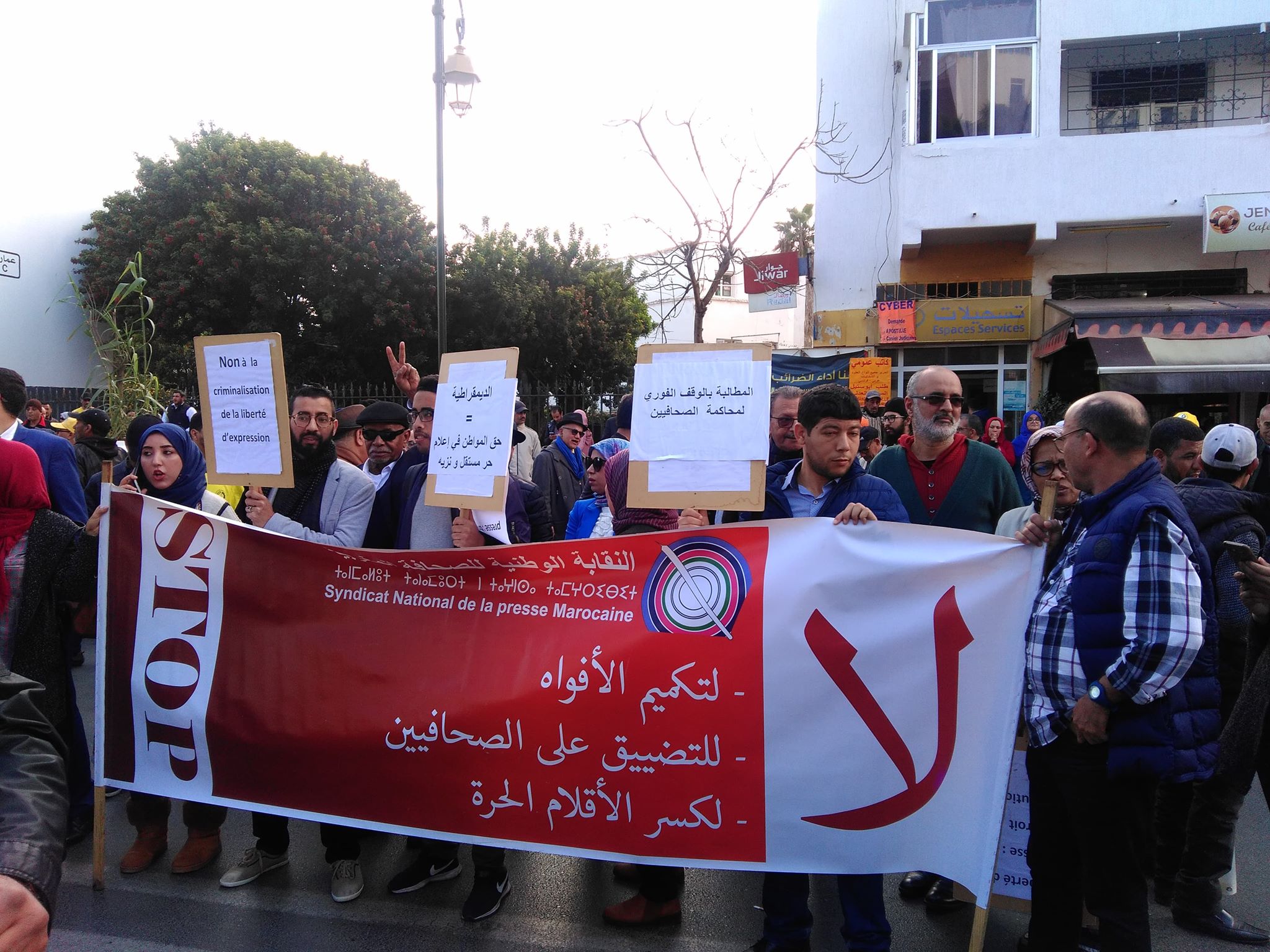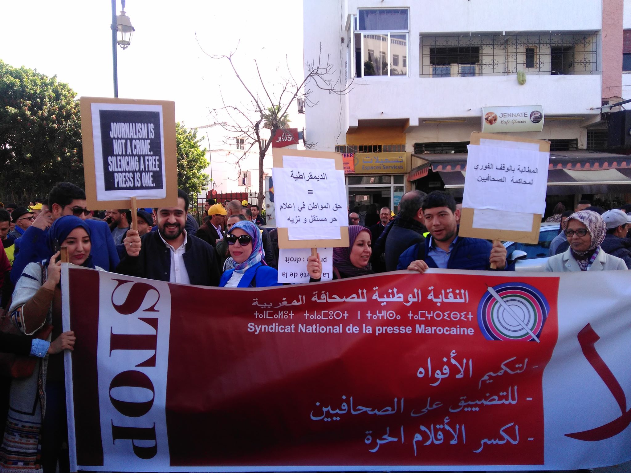 نظمت النقابة الوطنية للصحافة المغربية، وقفة تضامنية، صباح اليوم الأربعاء، مع الزملاء الأربعة المتابعين من طرف رئيس مجلس المستشارين حكيم بنشماش أمام المحكمة الإبتدائية بالرباط.