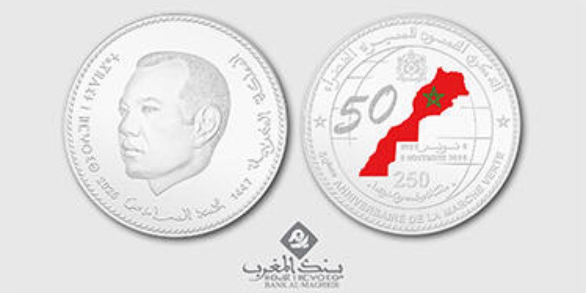 أصدر بنك المغرب قطعة نقدية تذكارية فضية من فئة 250 درهما، وذلك تخليدا للذكرى الخمسين للمسيرة الخضراء المظفرة. وفق ما كشف عنه اليوم الخميس، ضمن بلاغ صحفي.