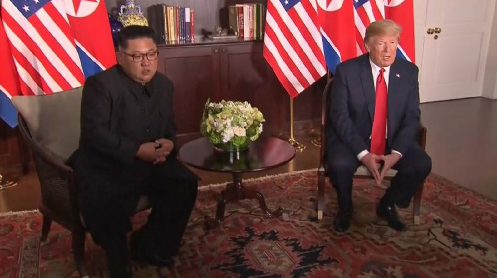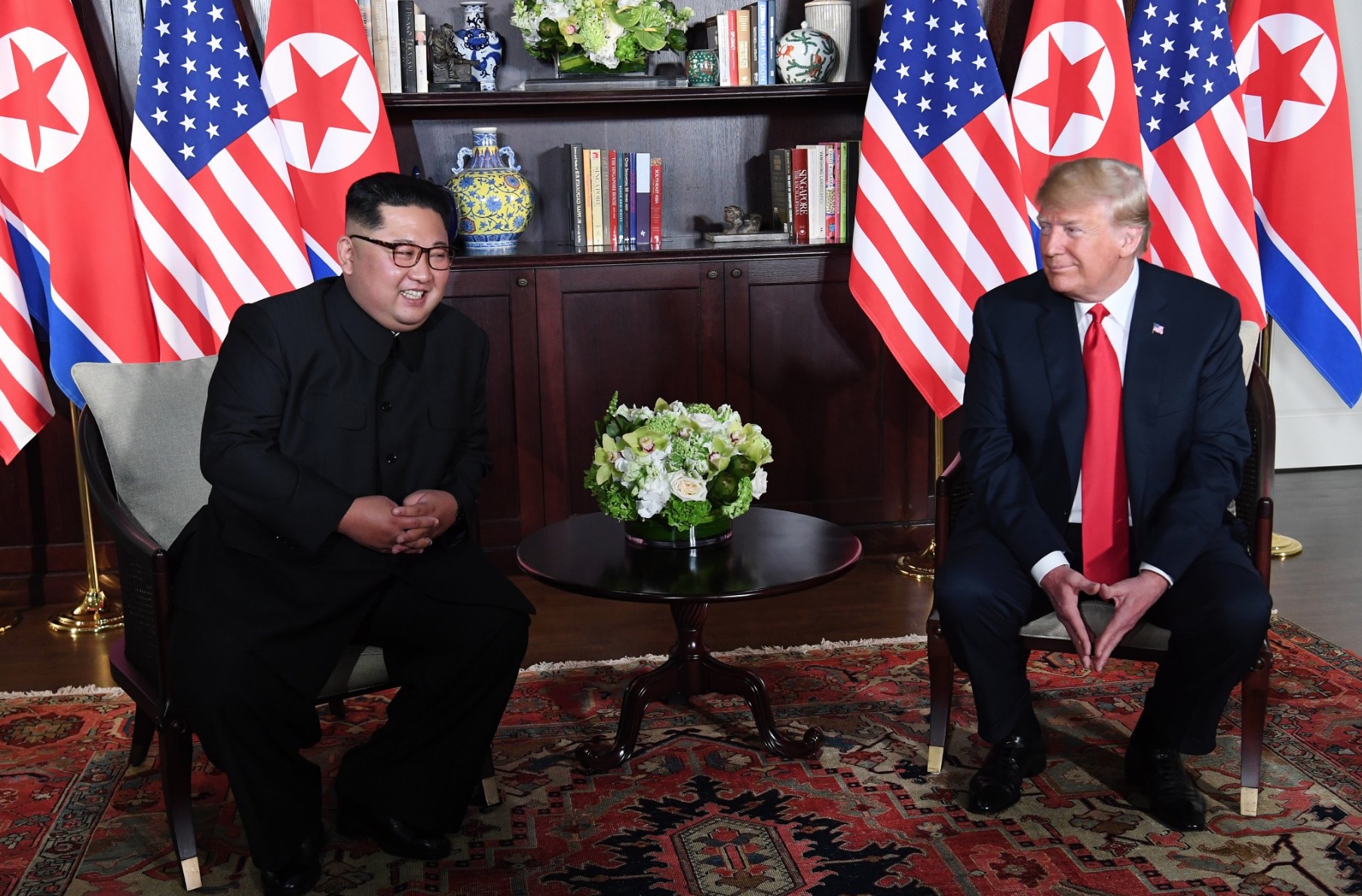 وفي مشهد لم يكن أحد ليتخيله قبل أشهر خلت، تصافح ترامب وكيم طويلا امام اعلام البلدين قبل ان يسيرا سويا على السجادة الحمراء ويتبادلا اطراف الحديث.