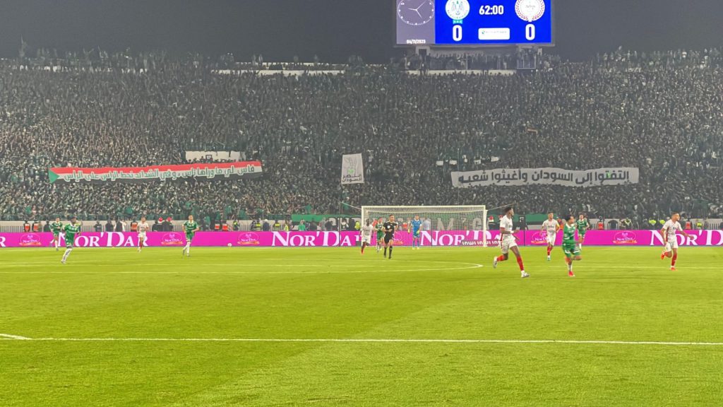 وتفاعلت الجماهير الرجاوية مع الأحداث التي تشهدها السودان من خلال رفع رسالة في مدرجات “دونور”، جاء فيها “التفتوا إلى السودان وأغيثوا شعبه.. فاس إلى ما وراها ناس وفي الشداد نحط الرأس على الرأس”.
